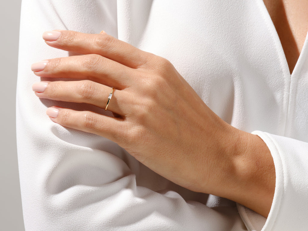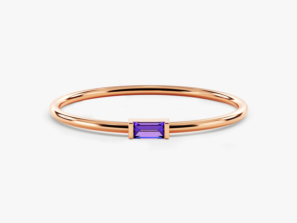 The Bezel Set Baguette Birthstone Ring features an elegant design where the baguette-cut stone stands out within a clean and modern setting. Its minimal lines highlight the natural beauty of the stone while allowing it to pair effortlessly with a variety of styles. Personalized with your chosen birthstone, it becomes a meaningful piece for yourself as well as a thoughtful gift option.