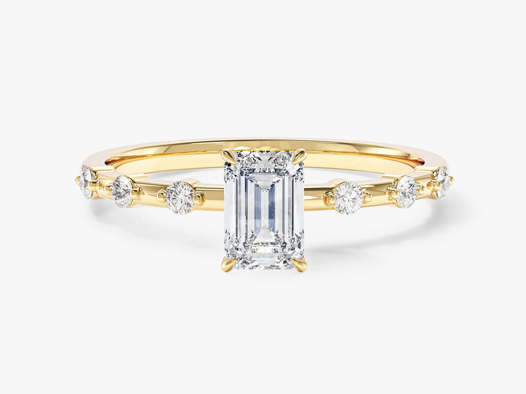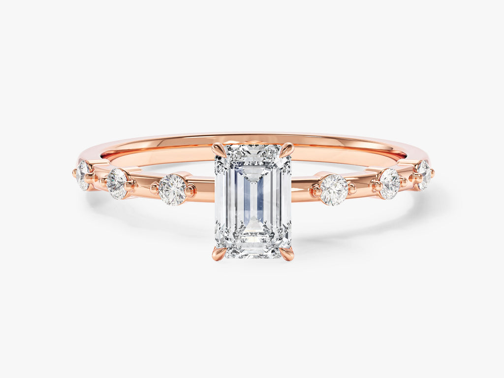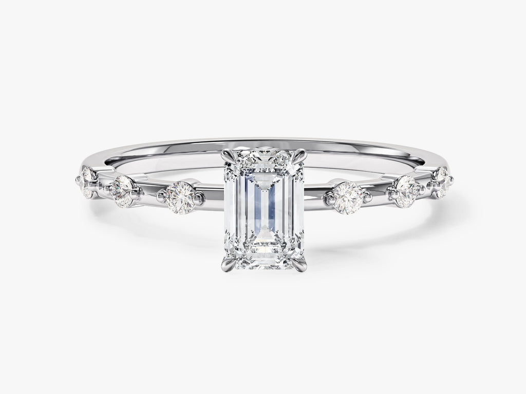 This engagement ring showcases a stunning emerald-cut center stone, flanked by a band of sparkling gemstone accents, offering a sleek and modern design with timeless sophistication.