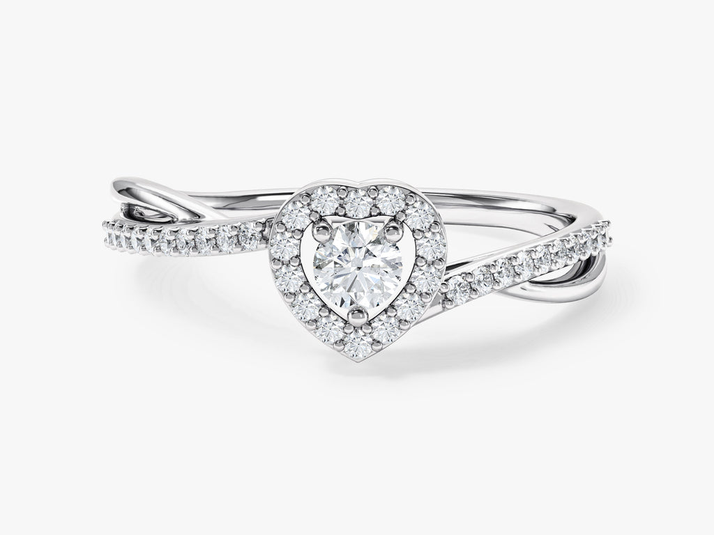 This engagement ring features a dazzling round stone surrounded by a heart-shaped halo of stones, with a twisted pave stone band adding extra sparkle. It is a perfect blend of romance and elegance.