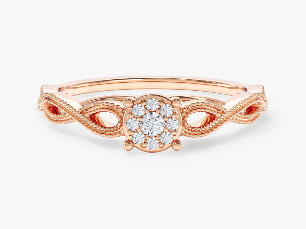 This ring features dazzling stones with a milgrain-detailed twisted band. It is a perfect blend of vintage-inspired elegance and modern sophistication.