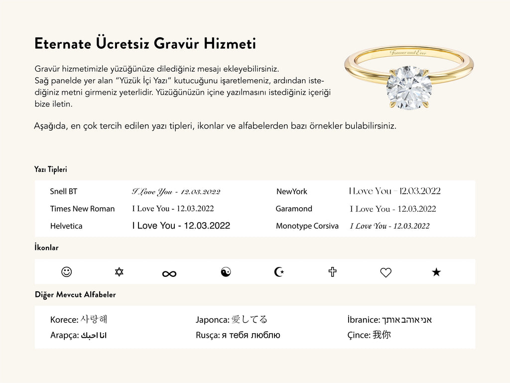 Eternate’ın özenle seçilmiş malzemeleri ve hassas ustalığı, yüzüğün hem şık hem de dayanıklı olmasını sağlar. Nişan yüzüğü arayanlar için romantik, zarif ve her stile uyum sağlayan bir seçenek sunar.