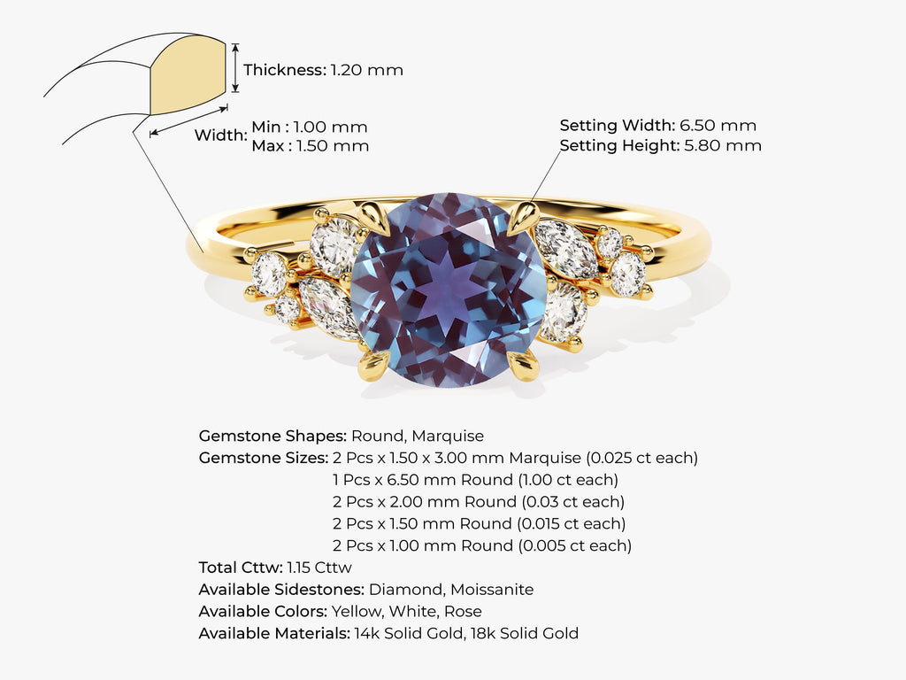 Our Round Alexandrite Engagement Ring, adorned by a breathtaking moissanite cluster,is a celebration of uniqueness and everlasting allure.The round-cut Alexandrite, a chameleon of color, invites you into a realm where hues shift like a dance of emotions.