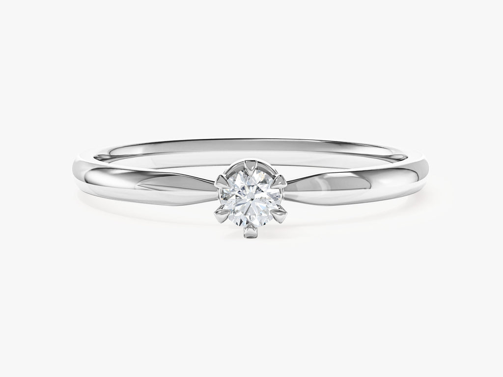 This promise ring features stunning round stone in a classic six-prong setting, embodying timeless elegance and brilliance.
